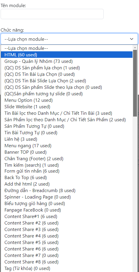 Hệ thống cung cấp sẵn nhiều module cho người dùng, nhà phát triển chị việc thêm vào các template layout, sau đó kéo thả vào các vị trí mong muốn là có thể sử dụng được, dưới đây là danh sách.