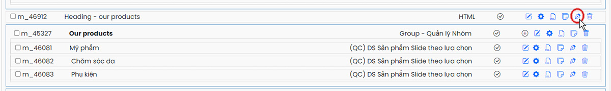 1. Đưa nội dung vào module HTML từ cấu hình template -> click vào cây bút như hình dưới -> Form biên tập nội dung sẽ hiển thị ra -> Nhập nội dung -> Cập nhật